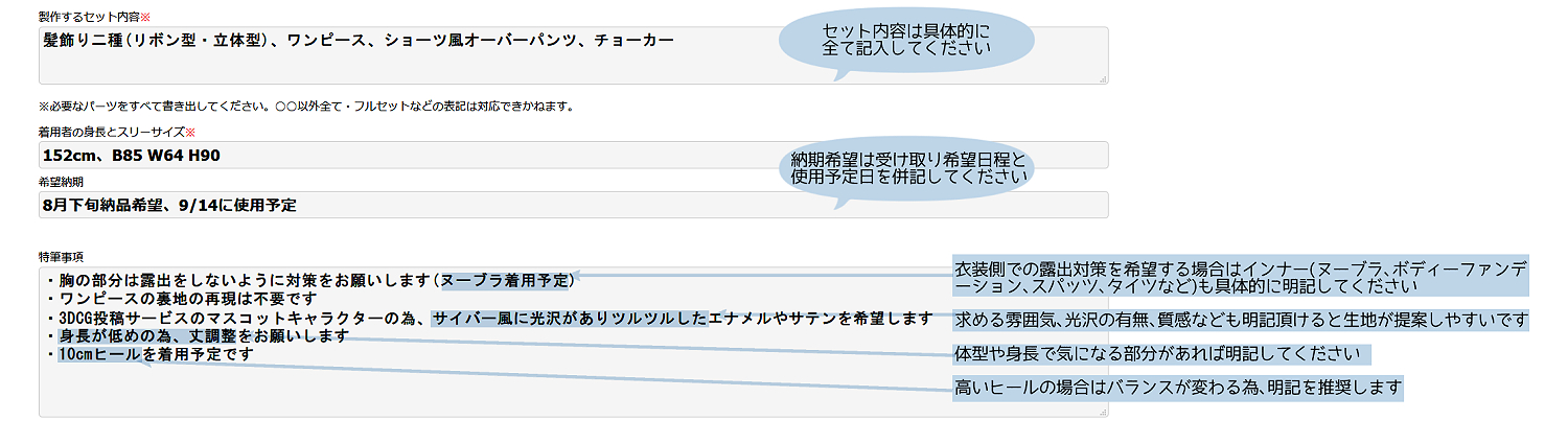 衣装の形状によって対応の不可が異なりますのでリピーター様も必ず明記ください。