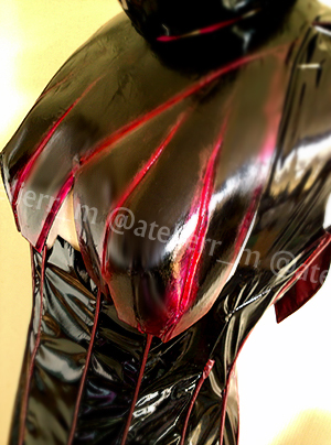 胸パーツはフィギュアに近い見た目にする為にウレタン造形で製作させていただきました。凹凸をつけて切出した物にエナメル貼りこみ上から赤をのせています。