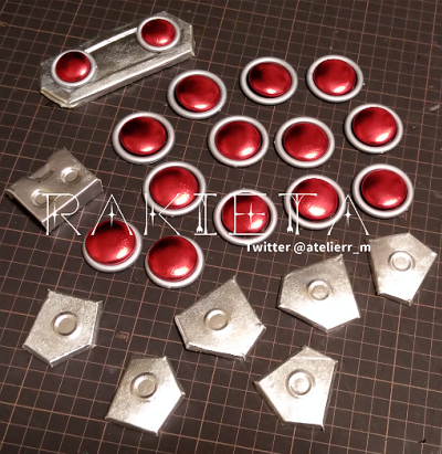 今月制作中の衣装は現在ここまで作業が終了しています。来週は造形パーツへの生地張り込み等の作業などを行う予定です
