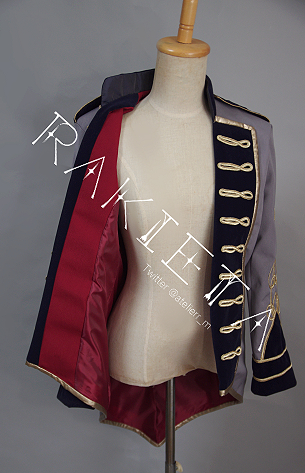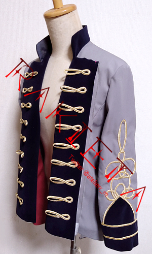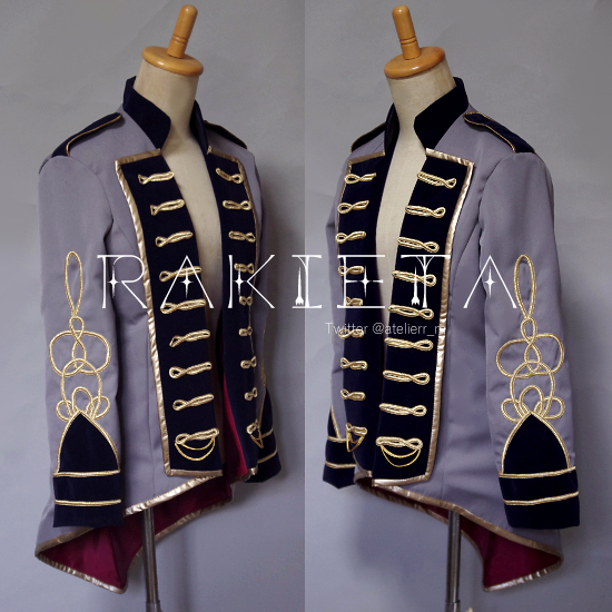 衣装を製作させていただきましたロングジャケットのみ、サイズ調整あり、カラー指定ありで前たて、肩章、襟は濃紺で制作しています